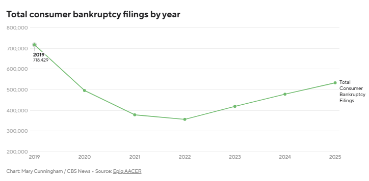 Total consumer bankruptcy filings jumped 12% from 478,752 in 2024 to 533,949 in 2025, according to Epiq AACER, a platform that provides U.S. bankruptcy filing data. Epiq, which tracks Chapter 7, Chapter 11 and Chapter 13 filings, relies on data provided through the U.S. Courts’ PACER system, an electronic database that houses federal court records.